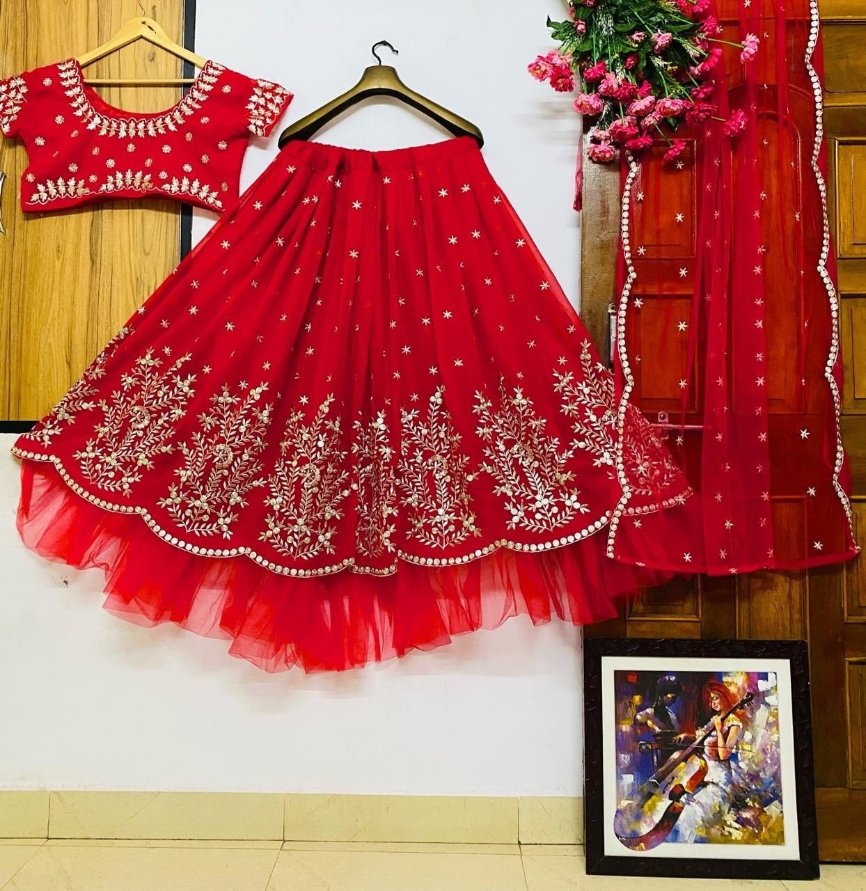 # LAHENGA : HEAVY GEORGETTE (FULLY STITCHED) WITH NET RUFFLES & EMBROIDERY WORK